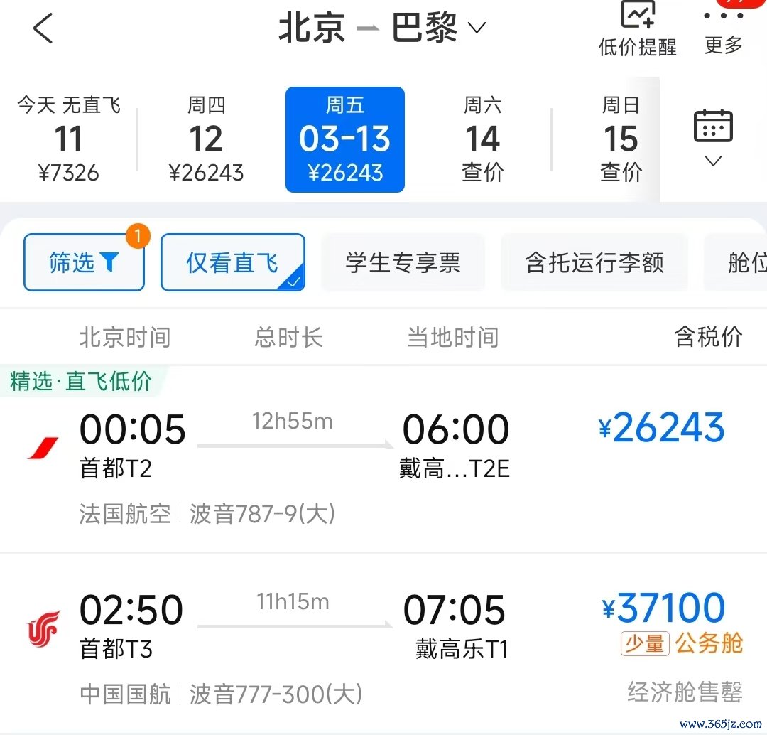 记者查询OTA发现,最近一周的中欧直飞航线延续上周的高票价,部分航班的经济舱已售罄。以北京-巴黎为例,3月12日法航的经济舱直飞机票最低26243元,国航的直飞机票已售罄;3月13日国航直飞巴黎也只剩公务舱。