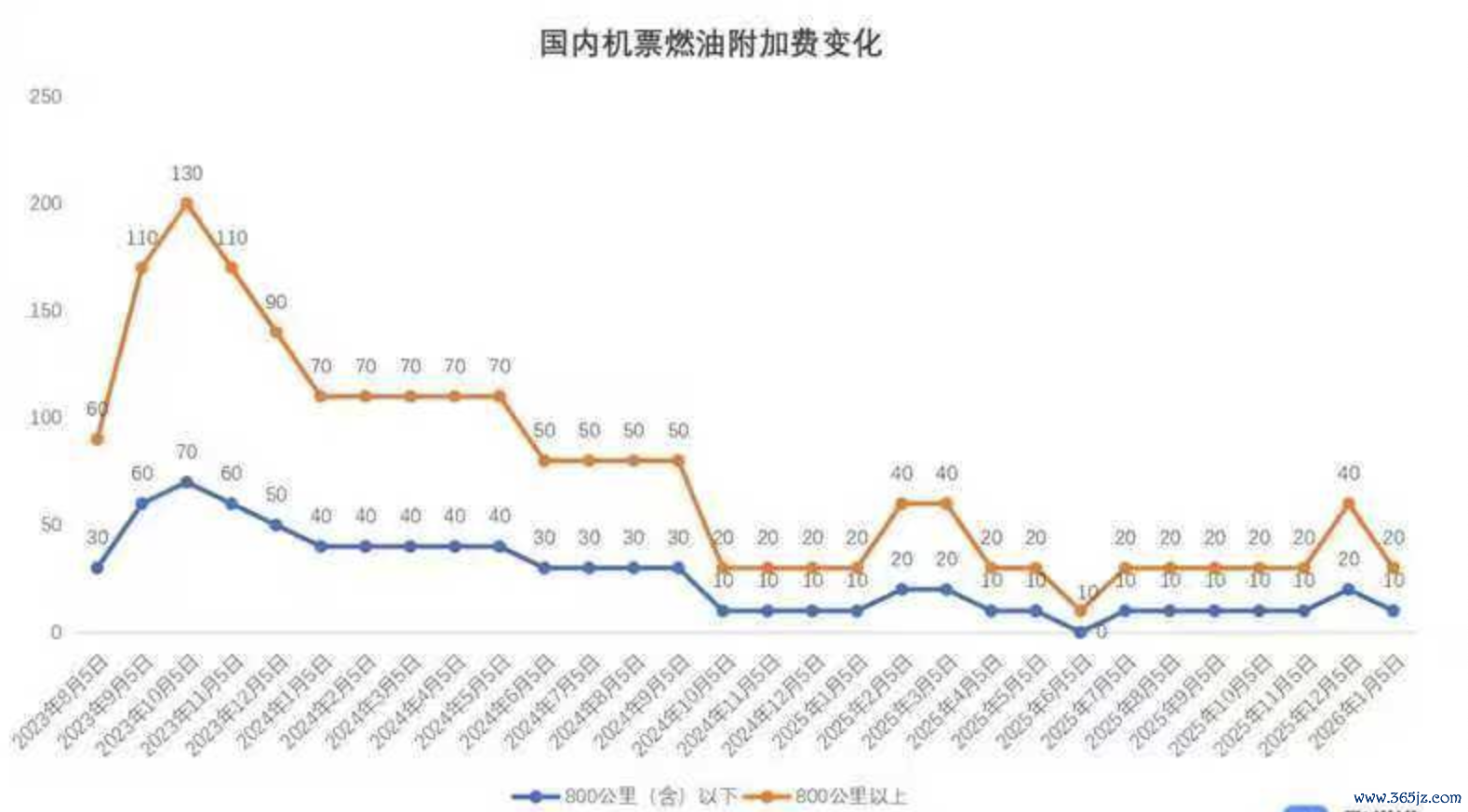 上一次调整国内航线燃油附加费是今年1月5日,当时800公里(含)以下航段收取燃油费10元,800公里以上航段20元,分别较前一个月下调10元和20元。下一个调价窗口将在4月5日到来。