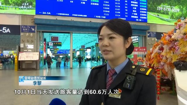 昆明站值班站长 李黎:“10月1日当天发送旅客量达到60.6万人次,创下了历史单日发送旅客量的新高。整个假期是以旅游流、探亲流为主,我们云南省境内的热门城市,像丽江、大理、香格里拉、西双版纳,差不多提前预售15天的时候票就已经全部卖完了。”