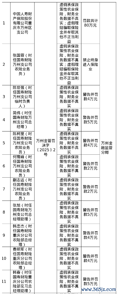 此外,对国寿财险万州支公司农险业务员张国蓉禁止终身进入保险业;对万州支公司临时负责人陈世强警告并处罚款4万元;对万州支公司总经理简伟警告并处罚款5万元;对万州支公司农险业务员陈柯里、何雪峰、蒯志远分别警告并处罚款4万元、2万元、2万元;对万州支公司总经理助理张旭警告并处罚款5万元;对重庆分公司农险部总经理韩忠杰、费明军分别警告并处罚款4万元;对重庆分公司农险部见习总经理助理韩春警告并处罚款5万元。
